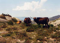 Nach einstündiger Suche auf unwegsamen, gerölligem Gelände und unter stechender Sonne entdeckten wir schließlich frische Fuß- und Kotspuren von Kühen. Domingos stieß einen gewaltigen Brüller aus, der gleich erwidert wurde. Es war aber nicht das Echo, sondern die Antwort kam von einem jungen Bauern, der hoch zu Ross aus Outeiro aufgestiegen war und sich im Schatten eines der seltenen Bäume niedergelassen hatte. Nicht weit von ihm graste friedlich eine Herde von dreißig Barroso-Rindern (typische Kennzeichen: braun-gelbe Färbung, kleiner Kopf, riesige Hörner). Doch leider waren es die falschen, nämlich die aus Outeiro.