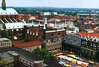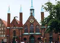 Lübeck: Rathaus (Mitte) und Marienkirche (links)