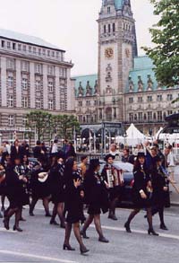 Tuna da Universidade do Porto vor dem Hamburger Rathaus während des Festzugs (cortejo) vor Beginn des Arraial 2002
