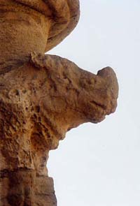 Weniger Glück hatte das Konterfei von Ganga. Ich spreche nicht von dem Dürerschen Stich, der nach wie vor als ein Meisterwerk des deutschen Malers gilt, sondern vielmehr von dem Nashornkopf am Turm von Belém selbst. Er ziert das rechte (vom Hieronymuskloster aus gesehen) Ecktürmchen. Aber unglücklicherweise ist man ihm bei der Reinigung mit einem für den weichen Sandstein zu kräftigen Sandstrahlgebläse zu Leibe gerückt, so dass er fast unkenntlich ist. Als ich ihn bei meinem letzten Besuch sah, war ich richtig geschockt, denn er ähnelt eher der berühmten Sau von Murça!