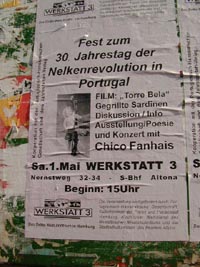 A "Revolução dos Cravos" - 30 anos depoisFoi uma grande festa, a 1 de Maio, na Werkstatt 3 em Ottensen, assistida por muitos amigos de Portugal e sócios nossos. Já começou da parte da tarde com a exibição do filme "Torre Bela". Entre a assistência, o cantor Francisco ("Chico") Fanhais que arregalou o olho a ver-se no filme junto com o seu amigo José ("Zeca") Afonso a actuarem e cantarem nessa cooperativa emblemática. Depois foi a vez de Thorsten Kolle, redactor da Merian que apresentou a nova edição do volume sobre Lisboa. Leu textos sobre os acontecimentos do 25 de Abril da autoria de Walter Haubrich e Julia Knobloch, seguido pela jornalista Swantje Strieder a ler trechos do seu artigo sobre os imigrantes pretos da Cova da Moura. E Peter Koj contou como reuniu todo o material informativo apresentado nas últimas 24 páginas da edição. A seguir reuniu-se no pódio um painel a discutir os acontecimentos revolucionários e pós-revolucionários que mudaram o rumo do País: António Borralho da Werkstatt 3, o próprio Chico Fanhais, Luís Carvalho e Peter Koj. Antes do concerto de Chico Fanhais, ainda houve tempo para recarregar as baterias no restaurante, onde se servia uma feijoada bem típica. O concerto, que começou pelas 21 horas, foi o auge incontestado da festa. O Chico, apesar do desgaste (estava a dar concertos em Portugal e na Alemanha do Norte há praticamente uma semana) conseguiu captar o público com a sua voz bonita e as explicações dadas à cada canção. A festa foi organizada pela Werkstatt 3 em cooperação com a nossa associação. Outro contributo nosso foram os murais de Lisboa que já exibimos há 5 anos no Kulturhaus Eppendorf. Quem ainda não os conhece, pode mirá-los no restaurante onde vão ficar pendurados ainda algum tempo. |