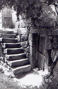 Tief ins Gebirge - die zwischen Minho und Trás-os-Montes gelegene Serra do Marão - hat sich ein Flüsschen eingegraben. Die Schlucht weitet sich und macht Platz für eine Ansammlung von Hütten. Sie sind direkt auf die Felshänge gebaut, sind Stein aus ihrem Stein, noch ganz verwachsen mit der Natur. Doch die kleine Siedlung ist auch Teil einer entwickelten Kultur: Am Flussufer sind die schmalen Randstreifen mit Erde - vielleicht vom Fluss angeschwemmte fruchtbare Erde - aufgeschüttet, bewässert und bepflanzt. Kleine Gärten folgen aufeinander. Zu beiden Seiten, ein geringes Stück den Fluss entlang, stehen Weinstöcke. Ihre Ranken klettern bis auf ein Drahtnetz, das über den kleinen Fluss gespannt ist, und bilden ein schattenspendendes Dach, von dem sich blaue Trauben senken.