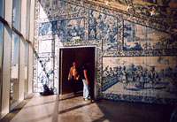 Riesige Rollos können den Raum vollkommen verdunkeln. Als wir in ihn hineinsehen, probt dort in hellem Tageslicht, bei halb herabgelassenem Rollo unhörbar ein Orchester. Wir stiefeln über Kabel, gehen durch Türen, Flure, finden uns in einem violetten Raum für Kinder wieder, in dem sie während des Konzertes ihre Eltern sehen und etwas über Musik erfahren können, die gerade gespielt wird. Wir steigen Treppen hinauf in den VIP-Raum im obersten Stockwerk, der zur Straße hin mit bis auf den Boden reichenden Fenstern und sonst mit blau-weißen Azulejo-Painéís versehen ist. Von einer spitz zulaufenden, ebenfalls mit Azulejos verkleideten Terrasse aus kann man über die Stadt blicken. Überall wird gebohrt, gehämmert, gesägt. Eine Gruppe wichtig dreinblickender Herren in dunklen Anzügen schreitet ernst durch die Räume, hält beratschlagend inne, und wir warten, bis sie mit ihrer Besichtigung fertig sind, bevor wir unsere fortsetzen. Wir steigen labyrinthische Treppen wieder herunter zu den Verwaltungsräumen, den Künstlergarderoben, den Übungsräumen, der Kantine. Meine Kondition lässt zu wünschen übrig! Und dann öffnet sich eine Tür und wir stehen wieder im gleißenden Sonnenlicht. Die Architektengruppe sammelt sich um den jungen Guide, mein Bruder und ich setzen uns diskret wieder ab.