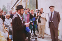 Fritz Teppich 1994 bei einer Aktion des "Jüdischen Runden Tisches" (hier: jüdisches Totengebet) gegen den Missbrauch des Namens Kempinski der Kempinski-Hotelkette, die 1942 von den Nazis "arisiert" wurde. Berlin, Fasanenstraße