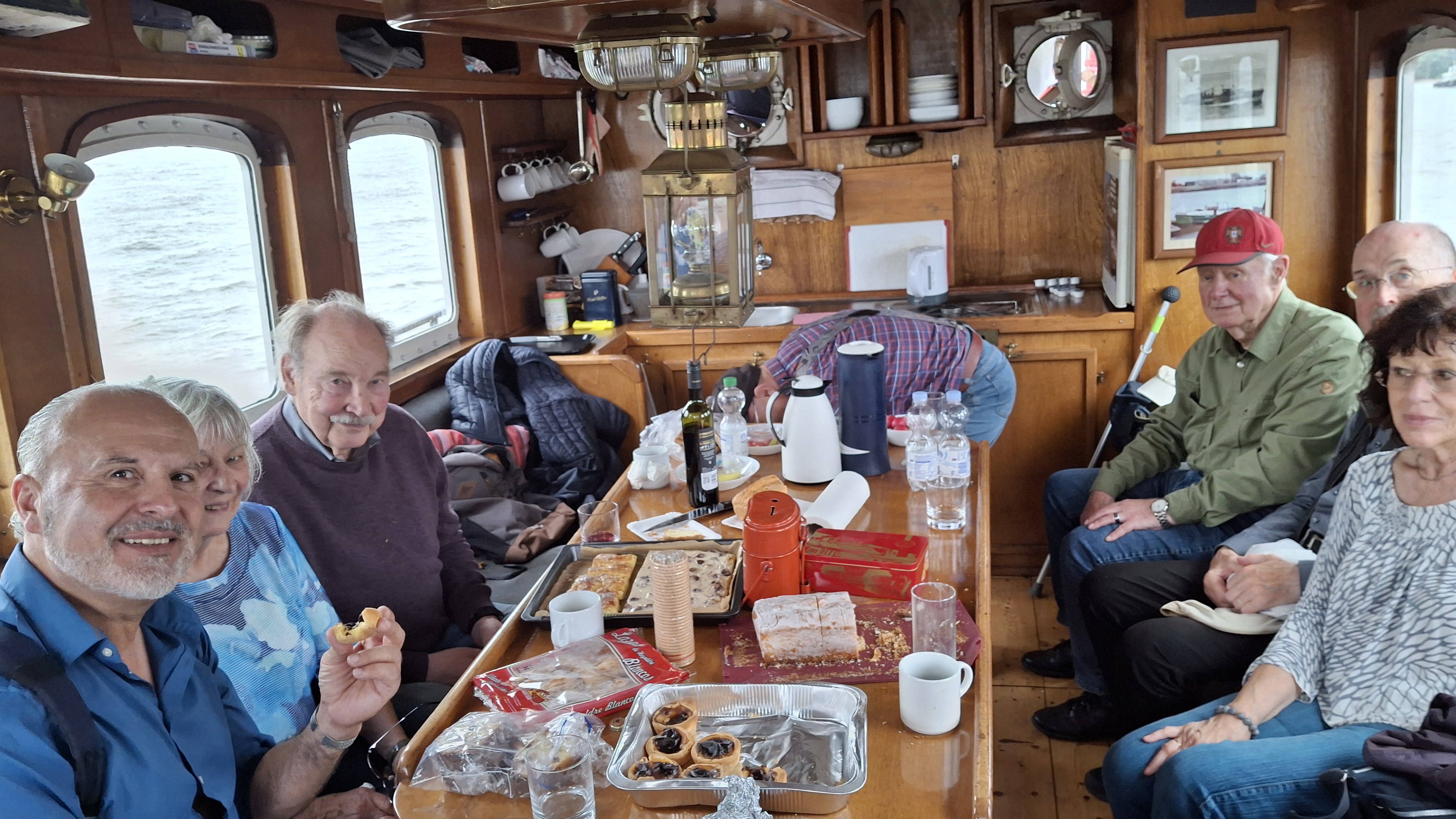 Traditionell fand am 30.9. erneut eine Ausfahrt mit dem Löschboot MS Repsold im Hamburger Hafen statt. Trotz einiger unerfreulicher Krankheitsfälle war die Fahrt gut besucht, und wir starteten pünktlich um 15 Uhr vom Anleger im Traditionsschiffhafen am Sandtorkai. Wie schon 2024 lachte die Sonne bei mildem Wetter mit wenig Wind. Kapitän Henning steuerte das Schiff aus dem Hafenbecken, und wir nahmen Kurs auf die Museumsschiffe MS Bleichen und den Segler Peking am Schuppen 52. Im Gegensatz zum letzten Jahr hatten die Mitreisenden fleißig gebacken, auch dem leckeren Butterkuchen von Wiedenroth wurde erfreut zugesprochen. Das Kuchenbuffet war perfekt.