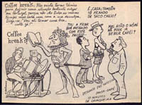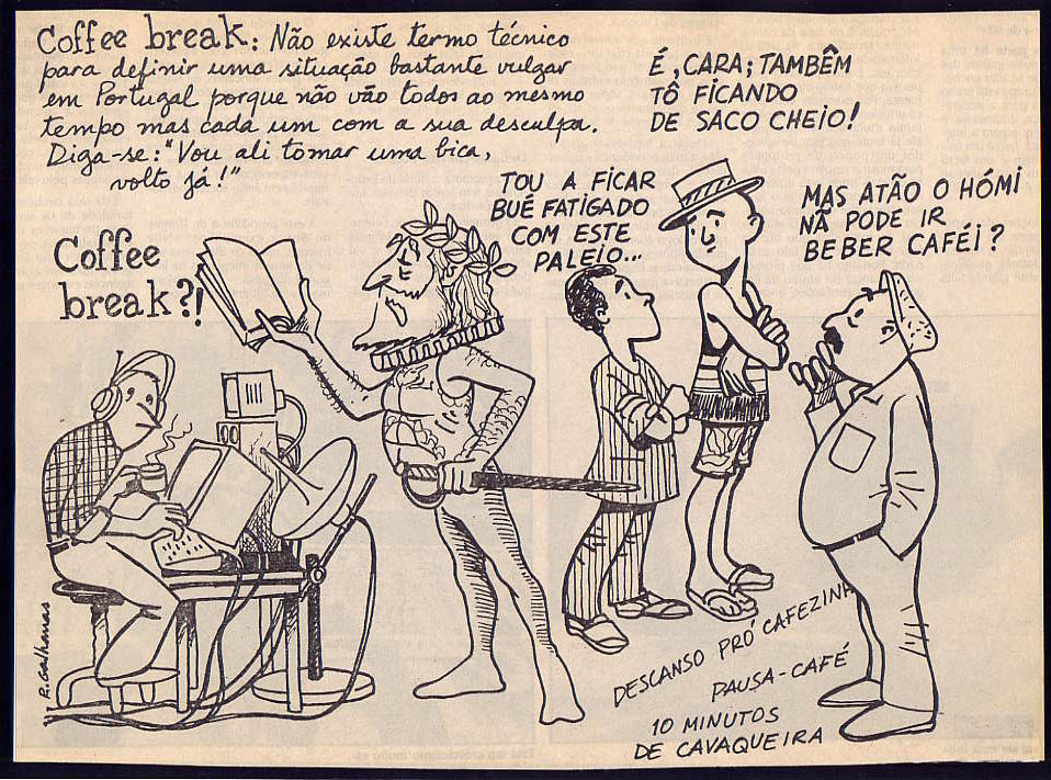 Die verschiedenen Vorschläge, coffee break auf portugiesisch wiederzugeben (Descanso pró cafezinho. Pausa-café. 10 minutos de cavaqueira.) verwirren den Lissabonner Yuppie, den Brasilianer, den Alentejaner (von links nach rechts) nur und steigern noch mehr ihren Kaffeedurst. Hätten Sie einen praktikablen Vorschlag?