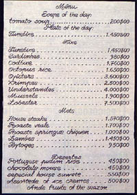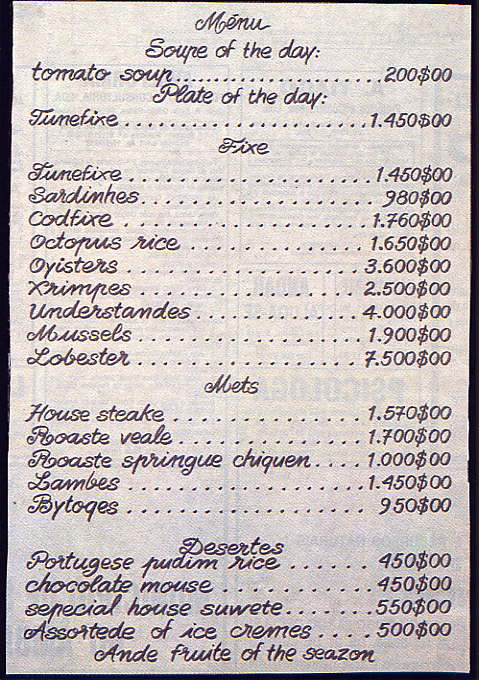 Na, haben Sie die Karte entziffern können? Man muss schon sehr gut Englisch und Portugiesisch beherrschen, um das sprachliche Mischmasch zu entwirren. Sollte es Ihnen sogar gelingen zu erraten was sich hinter den Understandes verbirgt, lassen Sie es uns wissen: es winkt Ihnen der "Helge-Dankwarth-Gedächtnispreis"!