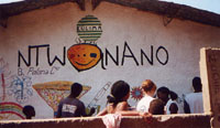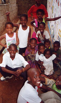 Kinder neben der selbst bemalten Wand des Ntwanano Zentrums