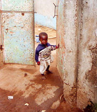 Wir machen unseren üblichen Weg durch das Viertel. Man kennt uns inzwischen, grüßt, lacht und geht wieder den eigenen Dingen nach. Kinder rasen wie wild um jede Ecke, treiben metallene Ringe mit Stöcken vor sich her, schieben selbstgemachte Autokonstruktionen durch den Sand, springen über kaputte Autoreifen und jagen einander in jener kindlich-unbesorgten Art und Weise, die hier sicherlich nur im Kindesalter existiert - und wenn der Magen nicht allzu heftig knurrt. Einige Windungen weiter im Inneren des Blechhauslabyrinths heißt uns der Hauptsitz des Projektes mit seiner kürzlich neu bemalten Wand willkommen. Wir haben die raue Außenseite des Gebäudes mit Hilfe der Kinder mit bunten Bildern verziert.