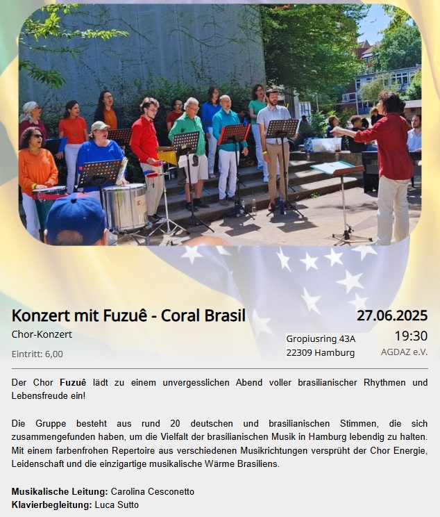 Ankündigung: Chorkonzert des brasilianischen Chors Fusuê bei AGDAZ in Steilshoop am Fr. 27. Juni um 19.30 Uhr