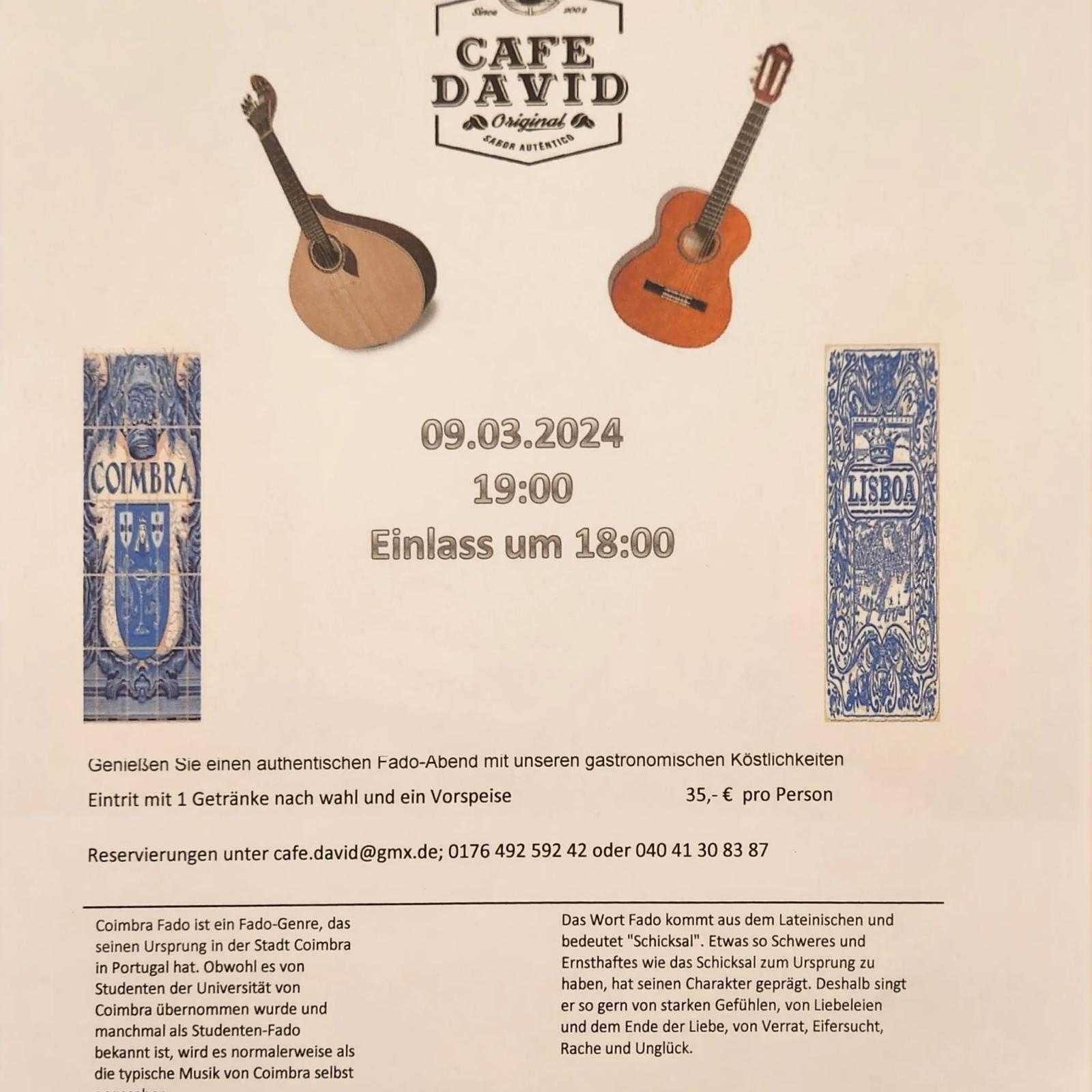 Nach dem Auftritt der Gruppe Barco Negro im Restaurante Café David soll es nun am 9.März zu einem Abend mit Fado de Coimbra kommen.