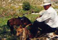 Nach einstündiger Suche auf unwegsamen, gerölligem Gelände und unter stechender Sonne entdeckten wir schließlich frische Fuß- und Kotspuren von Kühen. Domingos stieß einen gewaltigen Brüller aus, der gleich erwidert wurde. Es war aber nicht das Echo, sondern die Antwort kam von einem jungen Bauern, der hoch zu Ross aus Outeiro aufgestiegen war und sich im Schatten eines der seltenen Bäume niedergelassen hatte. Nicht weit von ihm graste friedlich eine Herde von dreißig Barroso-Rindern (typische Kennzeichen: braun-gelbe Färbung, kleiner Kopf, riesige Hörner). Doch leider waren es die falschen, nämlich die aus Outeiro.