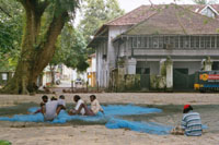 Cochin, Customs Jetty, Anleger beim ehemaligen Zollamt, im Vordergrund: Fischer beim Flicken ihrer Netze