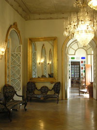 Wieder auf dem Treppenabsatz angekommen, fallen mir die in glänzenden Messinglettern geschriebenen Worte "Meneses-Bragança" ins Auge. Es gibt eine weitere, identische Eingangstür links davon. Als ich frage, was dahinter zu finden sei, ist die Antwort: Etwa das gleiche. Das schreckt mich nicht: Ich will "das Gleiche" sehen. Der kleine Mann drückt auf die Klingel, eine Dame mit großer Brille öffnet, bittet uns in bestem Englisch herein und führt uns kundig und alles voller Stolz erklärend durch den Westflügel des Hauses. Auch hier gibt es einen Vorraum mit schönen alten Möbeln, an den sich der Ballsaal anschließt. Wieder Kristalllüster und Marmorboden. Anders als beim Ostflügel, der L-förmig ist, gruppieren sich im Westflügel die Räume um einen Innenhof, auf den auch einige Fenster hinausgehen, die Muschelplättchen als Fensterscheiben haben.