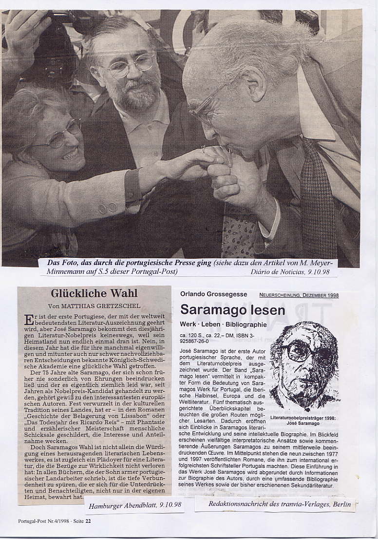 Dann fand eine erste, improvisierte Pressekonferenz statt. Die habe ich nicht mehr miterlebt. Aber ein Foto aus einer portugiesischen Zeitung hat mich gefreut: Saramago küsst seiner Agentin und Übersetzerin des letzten Buches, Ray-Güde Mertin, die Hand!