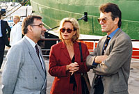 25-Jahr-Feier der Hanseatica Rück am 3. 6. 1999: Der portugiesische Generalkonsul in Hamburg J. Bulhão Martins, Erika Koj, Peter Koj vor der „Rickmer Rickmers“